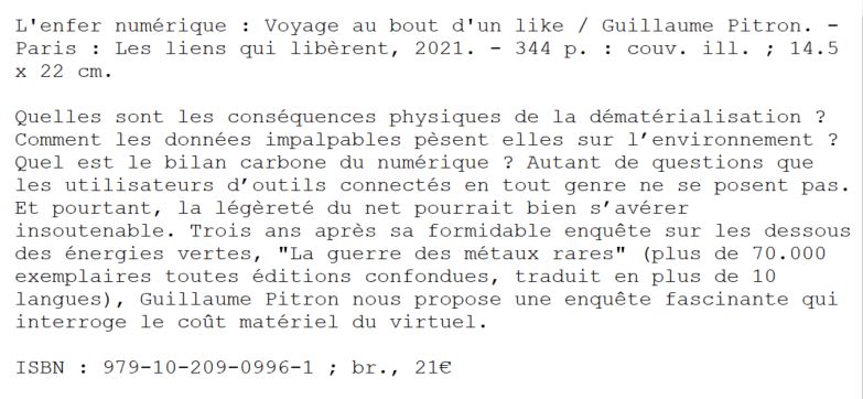 On peut aussi bien tout simplement reprendre la structure de la fiche ISBD classique pour présenter l’ouvrage de Guillaume Pitron. Tous les éléments sont sur cette fiche “format public” de la BNF